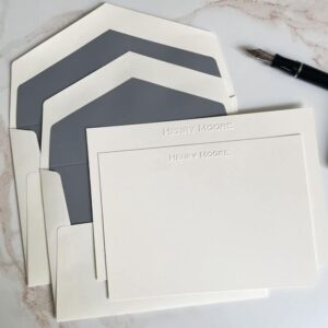 25 Personalized Flat Cards with matching envelopes Customize your text in our one of our popular lettering styles High-Quality Raised Ink Flat Cards, Paper Size: 4.5″ x 6.25″ Paper Stock: Triple-Thick (140 lb. cover weight – thickness of a gift card) Personalization Process: Raised Ink (Thermography)