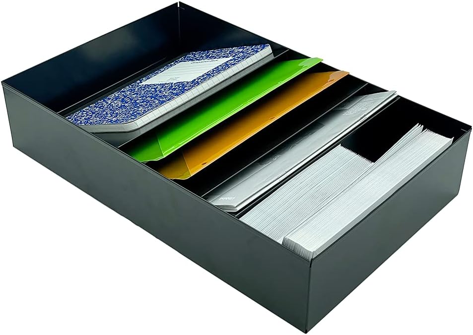 Constructed of long lasting, durable commercial-grade steel Your choice of 3, 4, or 5 compartments, each of which stores up to .75 in of paperwork each Can be wall mounted or placed in a drawer Screws and wall anchors included for wall mounting Scratch and chip-resistant glossy black finish